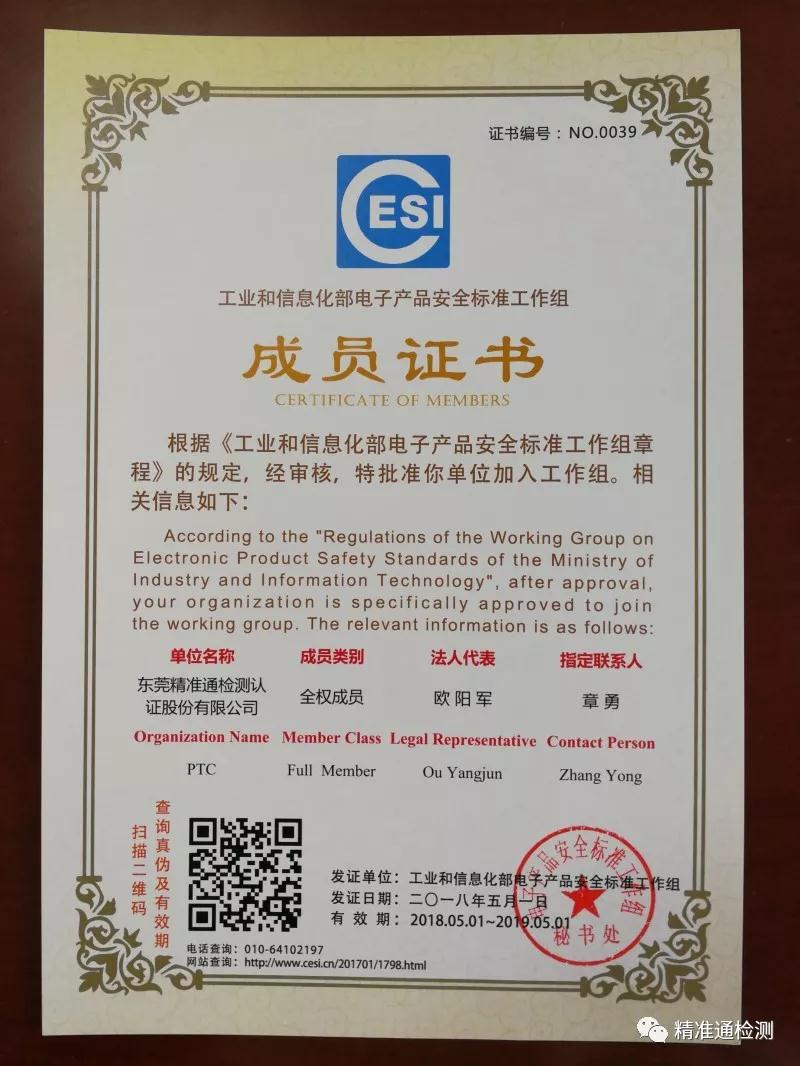 据工信部电子产品安全工作组通知,精准通检测认证股份有限公司(以下简称“精准检测”)正式加入工业和信息化部电子产品安全标准工作组,并成为全权会员,证书号:0039。